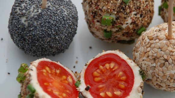 Pour changer des brochettes de tomates cerise-mozzarella, le blog culinaire cabouffeundoberman.blogspot.fr vous propose de confectionner des boulettes de tomates cerise au chèvre à picorer à l'aide de cure-dents. Une petite recette facile à réaliser, originale et qui devrait faire saliver vos invités lors de votre prochain apéro à la maison !